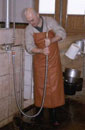 forward such that the cow's head, neck and spinal column form a straight line. Insert the line's head into the oral cavity at the tooth free rim of the jaw. Shove the line down the esophagus into the rumen until the mark on the line meets the incisors. Then the line's head is located in the rumen.