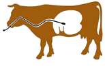 forward such that the cow's head, neck and spinal column form a straight line. Insert the line's head into the oral cavity at the tooth free rim of the jaw. Shove the line down the esophagus into the rumen until the mark on the line meets the incisors. Then the line's head is located in the rumen.